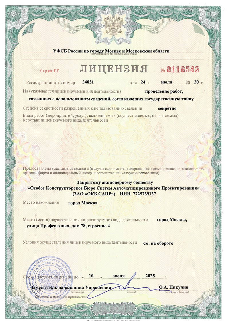 Лицензия ФСБ № 34831 от 24.07.2020 на проведение работ, связанных с использованием сведений, составляющих государственную тайну